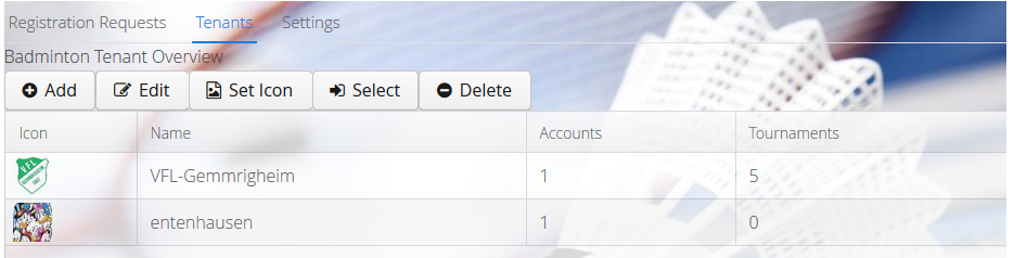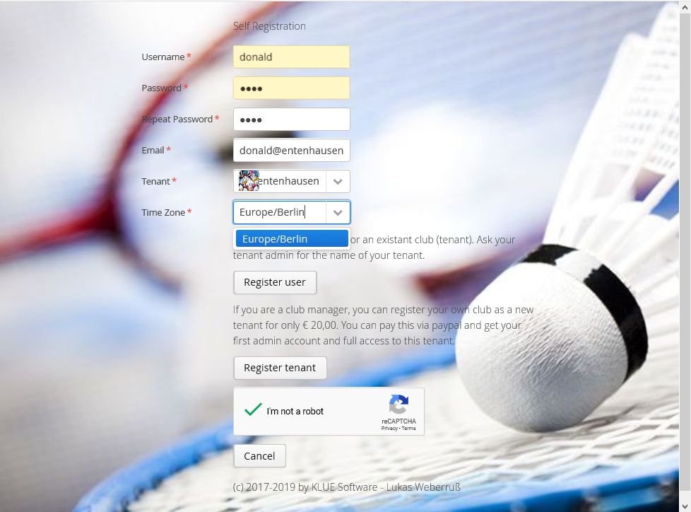 Ein Mandant entsteht automatisch, wenn der erste Administrator-Account erstellt wird. Nutzen Sie dafür den Registrierungslink auf der Startseite. Als Mandantenname empfiehlt sich der offizielle Vereinsname (ggf. ergänzt um eine Abteilung). Da Mandantenname und erster Account-Name systemweit eindeutig sein müssen, wählen Sie bitte eine eindeutige Bezeichnung mit Bezug zu Ihrem Verein. Der Erst-Account hat volle Administratorrechte. Optional können Sie unter „Settings“ ein Vereinslogo hinterlegen.