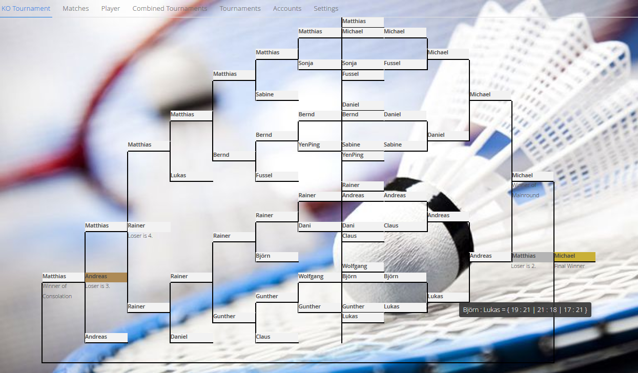 Klassische Turnierbäume für 8 oder 16 Einheiten (Einzel, Doppel oder Mixed). Fehlende Startplätze werden automatisch mit Freilosen (Dummies) aufgefüllt. Verfügbar sind Formate mit oder ohne Trostrunde. In der Trostrunde erhalten Verlierer der Hauptrunde eine zweite Chance auf das Finale.