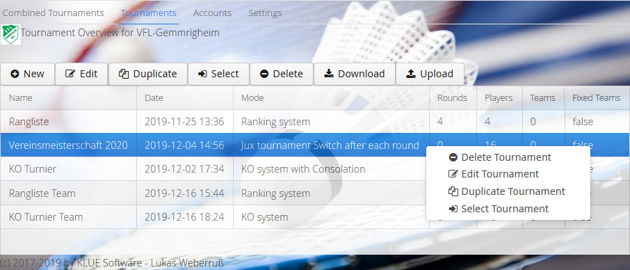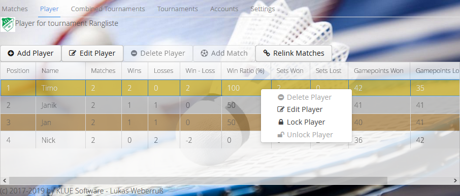 In diesem Hilfebereich finden Sie eine kompakte, aber vollständige Beschreibung aller Funktionen, die Sie für die Turnierverwaltung mit KLUE Badminton benötigen.